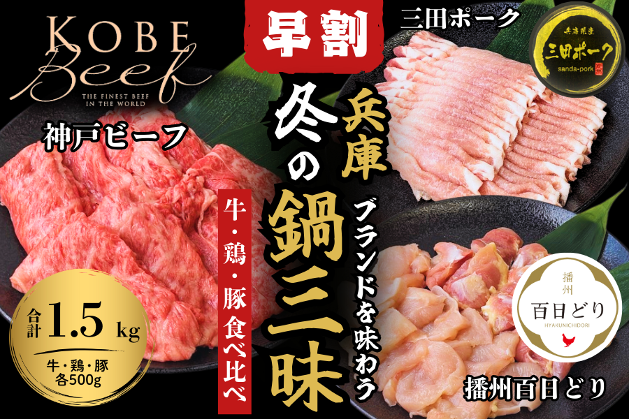 ■商品名:兵庫ブランドを味わう 冬の鍋三昧セット (神戸ビーフ・播州百日どり・三田ポーク 各500g)