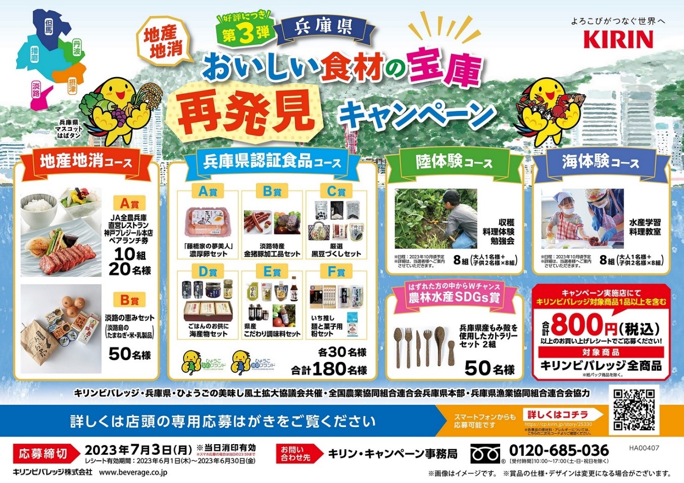 キリンビバレッジ株式会社、兵庫県、ひょうごの美味し風土拡大協議会は、兵庫県の農畜水産物やこれらを原材料とした加工食品及び家族で兵庫県の農業、水産業を学び、収穫や料理体験ができる「体験コース」等を懸賞品とした「おいしい食材の宝庫再発見キャンペーン」を6月1日から行いますので、奮ってご参加ください。
